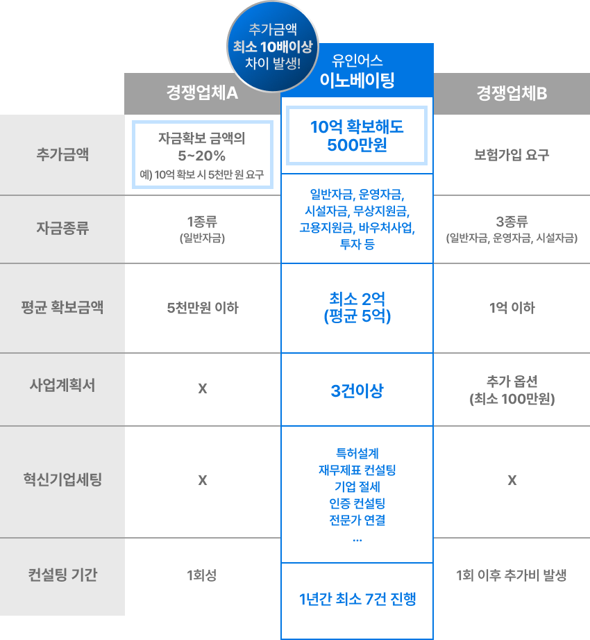 일반적으론, 매출의 ⅒ 수준으로만 융자가 가능합니다.그러나 유인어스 이노베이팅으로 혁신기업 전환 시,최소 3배 이상 높은 자금과 정부에서 운영하는다양한 지원 프로그램을 받을 수 있습니다.